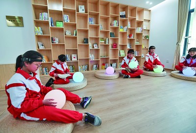 在浙江省嘉興市兒童青少年心理健康服務(wù)總站,學(xué)生們?cè)隗w驗(yàn)“腦波球”。新華社發(fā)