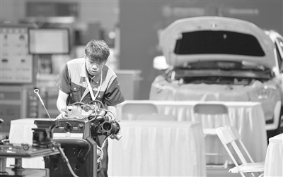 在天津舉行的首屆世界職業(yè)院校技能大賽上,參賽選手在進(jìn)行發(fā)動(dòng)機(jī)拆卸維護(hù)展演。新華社記者 孫凡越 攝