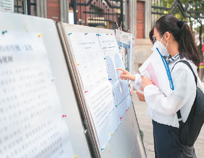 二○二二年七月七日,二○二二年上海市普通高等學(xué)校招生統(tǒng)一文化考試開(kāi)考,五萬(wàn)多名考生奔赴考場(chǎng)。圖為上海格致中學(xué)考點(diǎn),考生查看考場(chǎng)信息。 王 初攝(人民視覺(jué))