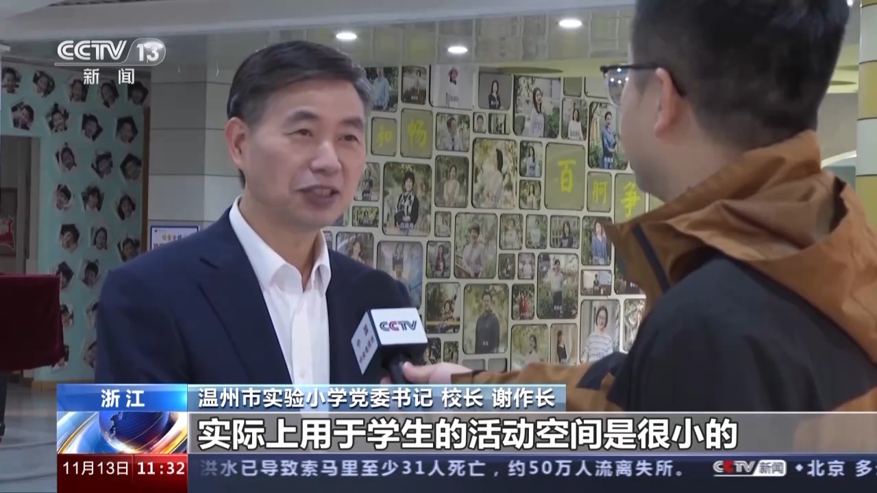 溫州市實驗小學黨委書記、校長 謝作長:這個6.6平方米,聽起來好像并不小,但它包含了會議室、食堂、教師辦公室等等功能房,實際上用于學生的活動空間是很少的,你看它只有省標的三分之一左右呀。但是再怎么困難,課間十分鐘是必須讓孩子們放松。