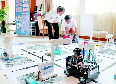 上海電子信息職業(yè)技術(shù)學(xué)院的師生展示智能機(jī)器人創(chuàng)新開發(fā)項目。 新華社發(fā)