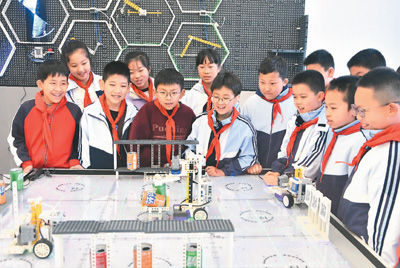 圖為江蘇省無錫市太湖格致中學以校園定點引導(dǎo)型機器人為主題,開展人工智能課堂教學。顧曉驊攝
