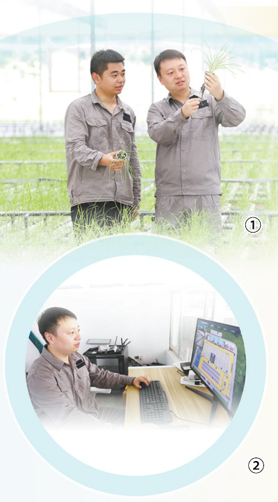 圖①:李脈(右)在觀察韭菜的生長情況。 圖②:李脈在通過電腦查看魚菜共生系統(tǒng)情況。 以上圖片均為劉輝攝