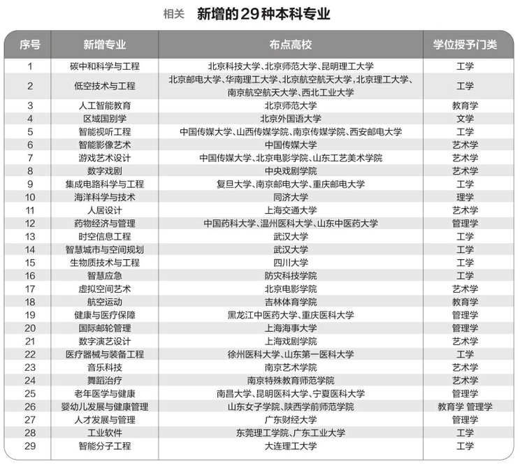 據(jù)悉,此次增設(shè)的29種新專業(yè),充分體現(xiàn)國家戰(zhàn)略、市場需求和科技發(fā)展牽引,在服務(wù)國家戰(zhàn)略方面,增設(shè)了區(qū)域國別學、碳中和科學與工程、海洋科學與技術(shù)、健康與醫(yī)療保障等專業(yè);面向科技發(fā)展前沿,增設(shè)了智能分子工程、醫(yī)療器械與裝備工程、時空信息工程等專業(yè);主動適應(yīng)市場需求,增設(shè)了國際郵輪管理、航空運動等專業(yè)。同時,聚焦人工智能賦能經(jīng)濟社會發(fā)展,增設(shè)人工智能教育、智能視聽工程、數(shù)字戲劇等專業(yè)。