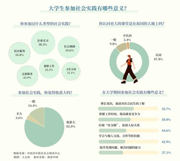 參與實(shí)地調(diào)研,開展支教服務(wù),進(jìn)入企業(yè)實(shí)習(xí)……這個(gè)夏天,不少大學(xué)生選擇用社會實(shí)踐作為暑假的打開方式。日前,中國青年報(bào)社社會調(diào)查中心聯(lián)合問卷網(wǎng)(wenjuan.com)發(fā)布的一項(xiàng)有1000名大學(xué)生參與的調(diào)查顯示,82.0%的受訪大學(xué)生認(rèn)為參加暑期社會實(shí)踐收獲大。對于參加社會實(shí)踐的意義,53.7%的受訪大學(xué)生認(rèn)為能增長見識,加深對社會民生的了解,50.0%的受訪大學(xué)生認(rèn)為能積累工作經(jīng)驗(yàn),提高就業(yè)競爭力。87.8%的受訪大學(xué)生認(rèn)同,更大的課堂是在祖國的大地上。 受訪者中,在讀專科生占18.1%,在讀本科生占70.8%,在讀碩博研究生占11.1%。 大學(xué)生積極投身社會實(shí)踐 今年7月份,陜西職業(yè)技術(shù)學(xué)院數(shù)字媒體技術(shù)專業(yè)的白琪瑤隨團(tuán)隊(duì)來到了陜西省渭南市白水縣,對蘋果產(chǎn)業(yè)進(jìn)行調(diào)研。在出發(fā)前,白琪瑤和團(tuán)隊(duì)成員搜集了白水蘋果的信息,比如品種、種植技術(shù)、口感評價(jià)等,到了實(shí)地后,通過深入田地、試驗(yàn)站和蘋果加工企業(yè),與蘋果種植戶、研究員、企業(yè)家深入交流,她對當(dāng)?shù)氐奶O果產(chǎn)業(yè)有了更加豐富立體的認(rèn)識?!拔覀兿M苗R頭展現(xiàn)白水蘋果的特色和價(jià)值,以短視頻的形式將白水蘋果推廣出去。” “這已經(jīng)是我?guī)W(xué)生參加暑期‘三下鄉(xiāng)’社會實(shí)踐的第七個(gè)年頭了?!标兾髀殬I(yè)技術(shù)學(xué)院的指導(dǎo)老師吉珍霞介紹,每年暑假,學(xué)校都會組織動(dòng)員學(xué)生開展社會實(shí)踐,鼓勵(lì)學(xué)生到基層“見社會”?!敖衲晡覀兪艿桨姿h農(nóng)業(yè)農(nóng)村局的邀請,到當(dāng)?shù)卣{(diào)研蘋果產(chǎn)業(yè)發(fā)展情況,鼓勵(lì)學(xué)生發(fā)揮數(shù)字媒體技術(shù)和動(dòng)漫制作技術(shù)的專業(yè)優(yōu)勢,教授農(nóng)戶短視頻拍攝及剪輯技巧,也結(jié)合專業(yè)特長,創(chuàng)作相關(guān)短視頻、科普漫畫,進(jìn)行文創(chuàng)設(shè)計(jì),為白水蘋果宣傳貢獻(xiàn)力量。” 在浙江省麗水市慶元縣五都小學(xué),來自蘇州大學(xué)音樂學(xué)院的吳佩怡和團(tuán)隊(duì)成員開啟了支教活動(dòng)。第一次擔(dān)任教學(xué)任務(wù),她感到責(zé)任重大?!皝碇拔揖烷_始備課了,設(shè)計(jì)了樂理課、合唱課等課程,希望能給孩子們帶來一個(gè)豐富多彩的暑假?!?/p> 安徽一所高校的大二學(xué)生陳遠(yuǎn)選擇利用暑期的時(shí)間到公司實(shí)習(xí),“找工作時(shí)實(shí)習(xí)經(jīng)歷越來越重要了,如果能有多段有含金量的實(shí)習(xí)經(jīng)驗(yàn),在就業(yè)時(shí)會更有競爭力。” 大學(xué)生們都參與了哪些社會實(shí)踐?調(diào)查顯示,企業(yè)實(shí)習(xí)(38.3%)、社區(qū)服務(wù)(34.8%)、社會調(diào)研(34.6%)、志愿服務(wù)(33.9%)排在前列。其他還有:兼職工作(22.2%)、文化交流(21.1%)、支教活動(dòng)(20.9%)、知識普及(19.3%)、創(chuàng)新創(chuàng)業(yè)(17.5%)、助農(nóng)服務(wù)(9.4%)。 通過社會實(shí)踐不僅能收獲技能和經(jīng)驗(yàn),更能完成從“學(xué)生”到“社會人”的身份轉(zhuǎn)變 剛上完課的第一天,吳佩怡就忍不住哭了?!昂⒆觽兊那笾軓?qiáng),雖然他們可能還聽不懂我講的樂理知識,但當(dāng)我?guī)е麄兒铣渡倌曛袊f》時(shí),他們認(rèn)真投入的模樣,讓我深受感動(dòng)。”經(jīng)過多天相處,吳佩怡和孩子們已經(jīng)“打成一片”,還有小朋友寫小紙條夸贊她,這讓她對授課內(nèi)容更自信了?!艾F(xiàn)在我會根據(jù)學(xué)生的反應(yīng),靈活調(diào)整教學(xué)方式和內(nèi)容,也學(xué)會用他們能理解的語言講授專業(yè)知識,這對我來說是非常寶貴的經(jīng)驗(yàn)?!?/p> 調(diào)查顯示,82.0%的受訪大學(xué)生認(rèn)為參加暑期社會實(shí)踐的收獲大。 在調(diào)研中,與一位村支書的交談讓白琪瑤印象深刻。村支書介紹,村里許多青壯年外出務(wù)工,使得蘋果種植面臨勞動(dòng)力不足的問題?!皩@個(gè)問題,我們第一反應(yīng)是吸引更多年輕人返鄉(xiāng),回到家鄉(xiāng)創(chuàng)業(yè),但村支書的一席話給我們上了一課——他說年輕人返鄉(xiāng)不太現(xiàn)實(shí),因?yàn)橥恋孛娣e有限,只靠種蘋果收益不樂觀。他提出的想法是推廣合作社,推動(dòng)規(guī)?;N植,提升農(nóng)戶收入和種植積極性?!卑诅鳜幱X得這讓她很受啟發(fā),“只有親自到現(xiàn)場,深入調(diào)研,才能了解到真實(shí)的情況,更全面地認(rèn)識社會民生和鄉(xiāng)村發(fā)展。” 調(diào)查顯示,87.8%的受訪大學(xué)生認(rèn)同,更大的課堂在祖國的大地上。對于參加社會實(shí)踐的意義,受訪大學(xué)生把增長見識,加深對社會民生的了解排在首位,獲選率為53.7%,積累工作經(jīng)驗(yàn),提高就業(yè)競爭力(50.0%),打破“社交圈”,拓展人際關(guān)系(43.6%)分別排在第二、三位。 其他還有:學(xué)會與他人交流、合作等軟技能(42.9%),提升發(fā)現(xiàn)問題、解決問題的能力(37.1%),鞏固專業(yè)知識,打磨專業(yè)技能(34.6%),提高服務(wù)社會意識,增強(qiáng)責(zé)任感(32.1%),得到他人的認(rèn)可,有獲得感(17.4%),獲得一定的經(jīng)濟(jì)收入(16.7%)。 