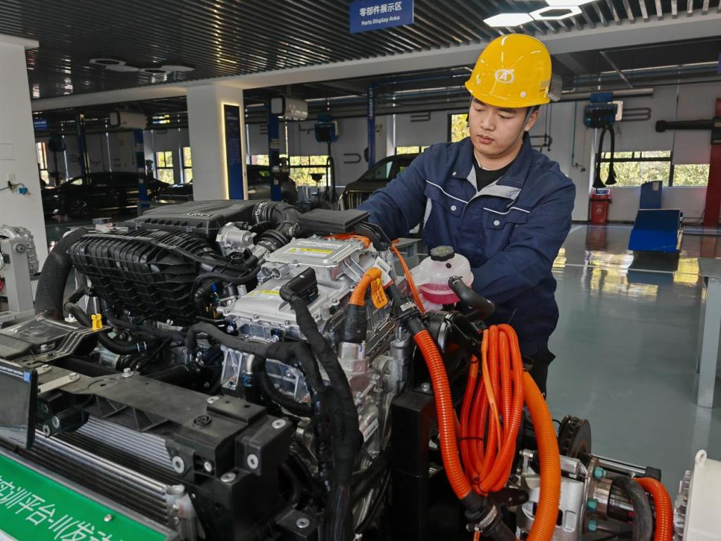 為支撐新能源汽車產(chǎn)業(yè)崛起,河南省全省高職院校開設相關專業(yè)點419個,相關在校生22.14萬人。在河南機電職業(yè)學院與比亞迪共建的現(xiàn)場工程師學院,圍繞“現(xiàn)場工程師”培養(yǎng)開發(fā)了37門項目化課程。該校每年向鄭州航空港區(qū)比亞迪工廠輸送1000余名技能人才,不少學生迅速成長為產(chǎn)線骨干?!皩W校通過‘項目+人才’雙交付育人模式,極大地增強了人才培養(yǎng)與企業(yè)需求的匹配度?!北葋喌峡傃b車間主任如是說。