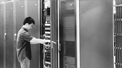 在東南亞電信(柬埔寨)有限公司建設(shè)的云數(shù)據(jù)中心里,工作人員正在調(diào)試設(shè)備。本報記者 張志文攝