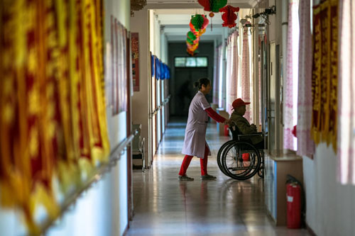 在一家敬老院,一名護(hù)理員用輪椅推著一名老人上電梯(2013年10月3日攝)。新華社發(fā)