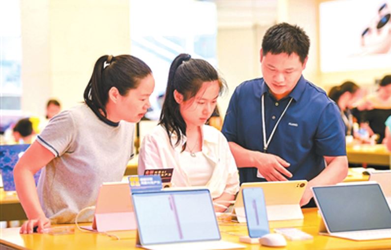 在江西省宜春市袁州區(qū)潤(rùn)達(dá)國(guó)際購(gòu)物中心的電子數(shù)碼產(chǎn)品專營(yíng)店內(nèi),工作人員向消費(fèi)者介紹平板電腦產(chǎn)品。