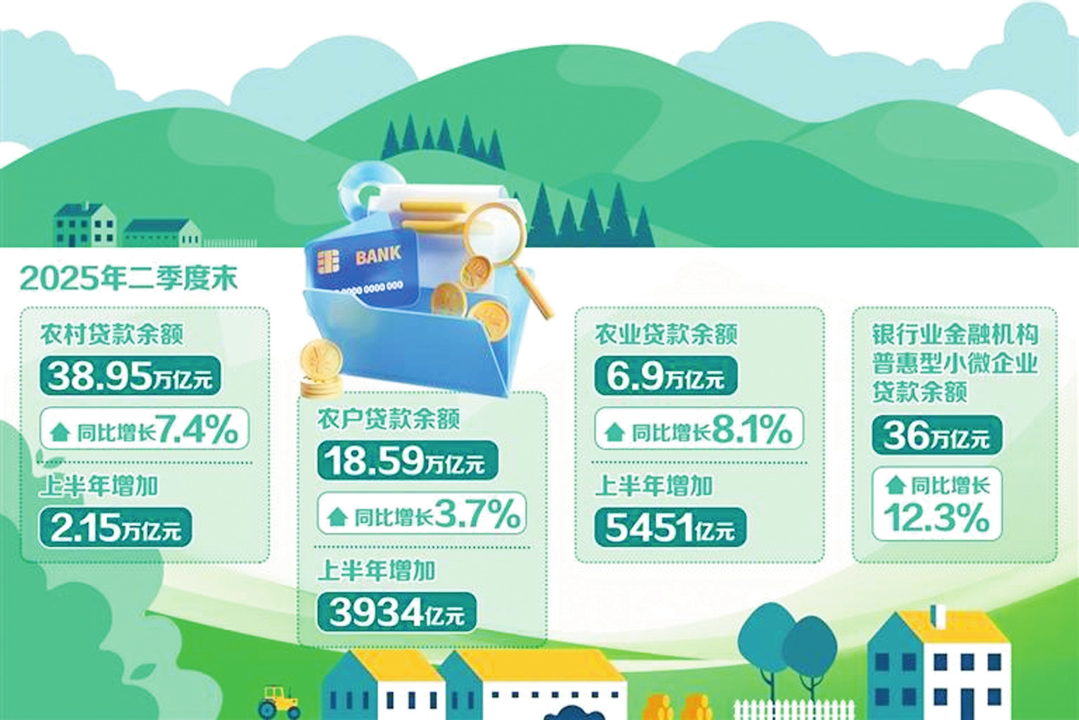 總的來(lái)看,今年二季度涉農(nóng)金融投放增量擴(kuò)面。2025年二季度金融機(jī)構(gòu)貸款投向統(tǒng)計(jì)報(bào)告顯示,2025年二季度末,農(nóng)村貸款余額38.95萬(wàn)億元,同比增長(zhǎng)7.4%,上半年增加2.15萬(wàn)億元。農(nóng)戶貸款余額18.59萬(wàn)億元,同比增長(zhǎng)3.7%,上半年增加3934億元。農(nóng)業(yè)貸款余額6.9萬(wàn)億元,同比增長(zhǎng)8.1%,上半年增加5451億元。