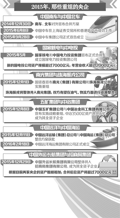 2015年,央業(yè)重組邁出重要步伐。有6對12家企業(yè)完成了重組,涉及至少27家上市公司,一批包括裝備制造、能源、航運(yùn)在內(nèi)的央企實(shí)現(xiàn)兼并重組,中央企業(yè)也由112家減至106家。2016年以來,繼1月25日中材集團(tuán)與中建集團(tuán)發(fā)布公告稱實(shí)施戰(zhàn)略重組之后,中國國旅集團(tuán)與中國港中旅集團(tuán)也發(fā)布公告稱籌劃戰(zhàn)略重組。此外,中航動力、成發(fā)科技、中航動控三家公司則于日前發(fā)布重組公告。離國務(wù)院國資委直接監(jiān)管的中央企業(yè)數(shù)量減至100家僅有“一步之遙”。