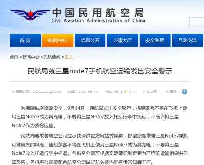 受三星“炸機(jī)門”事件持續(xù)發(fā)酵的影響,為了保障乘客出行安全,中國各大航空公司對三星Note7紛紛下達(dá)了“封殺令”! 9月13日,中國首家航空公司-海南航空宣布禁止集團(tuán)員工攜帶Note7登機(jī)、托運,并且也不接受旅客在飛機(jī)上使用和托運Note7。隨后,中國民航局要求各航空公司應(yīng)盡快通過官方網(wǎng)站等渠道,提醒旅客攜帶Note7乘機(jī)可能帶來的風(fēng)險。截至9月15日,中國國內(nèi)已有14家航空公司針對Note7出臺禁令。
