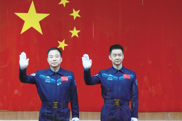 16日,神舟十一號(hào)載人飛行任務(wù)航天員景海鵬(左)、陳冬在酒泉衛(wèi)星發(fā)射中心出席記者見(jiàn)面會(huì)。