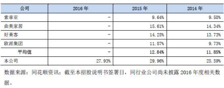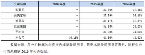 2014至2016年同行業(yè)公司綜合毛利率對(duì)比(來源:招股書)