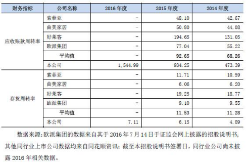 2014至2016應(yīng)收賬款周轉(zhuǎn)率及存貨周轉(zhuǎn)率與同行業(yè)公司對(duì)比(來源:招股書)