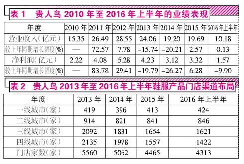 貴人鳥起家于傳統(tǒng)運動鞋服生產(chǎn)業(yè)務,在2014年上市之后,門店數(shù)量開始出現(xiàn)大規(guī)模萎縮。2013年至2016年上半年的財報顯示,貴人鳥在國內(nèi)布局的門店家數(shù)一路下滑,已經(jīng)由2013年時的5560家下滑至2016年上半年的4313家。
