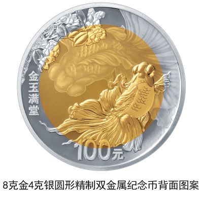 8克金4克銀圓形雙金屬紀(jì)念幣背面圖案為金魚(yú)與海棠花等組合圖案,并刊“金玉滿堂”字樣及面額。
