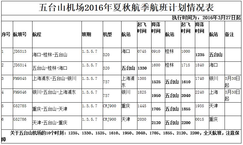二、2016年3月27日忻州市五臺(tái)山機(jī)場(chǎng)執(zhí)行民航夏秋季航班時(shí)刻,每周一、三、五、日、每日五班的航班時(shí)刻,車輛運(yùn)營(yíng)線路和運(yùn)營(yíng)時(shí)間如下。