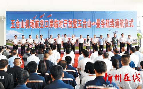 圖為五臺(tái)山機(jī)場(chǎng)航空口岸臨時(shí)開放暨五臺(tái)山——曼谷航線通航儀式現(xiàn)場(chǎng)。
