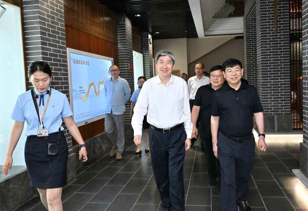 在中國(guó)汾酒城,朱曉東一行登上西城樓,俯瞰酒城全貌,聽(tīng)取汾酒城的建設(shè)規(guī)模、生產(chǎn)經(jīng)營(yíng)、產(chǎn)品銷(xiāo)售等情況介紹。隨后,朱曉東一行走進(jìn)汾酒博物館,通過(guò)館陳文物、文獻(xiàn)史料、文人墨寶等,切身感受汾酒集團(tuán)的企業(yè)文化,了解企業(yè)歷史沿革、技術(shù)創(chuàng)新及汾酒的釀造技藝等情況。