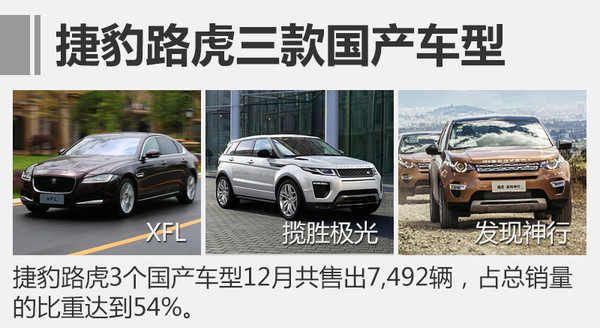 捷豹路虎去年能夠超越自我,實現(xiàn)新的銷量記錄,國產(chǎn)車型成為最重要因素。剛剛結(jié)束的2016年12月,捷豹路虎在華共售出13,859輛,與2015年同期(10,227輛)相比大漲36%。其中,捷豹路虎在華合資公司生產(chǎn)的3款國產(chǎn)車型捷豹XFL、路虎極光、發(fā)現(xiàn)神行,12月共售出7,492輛,占總銷量的比重達到54%。