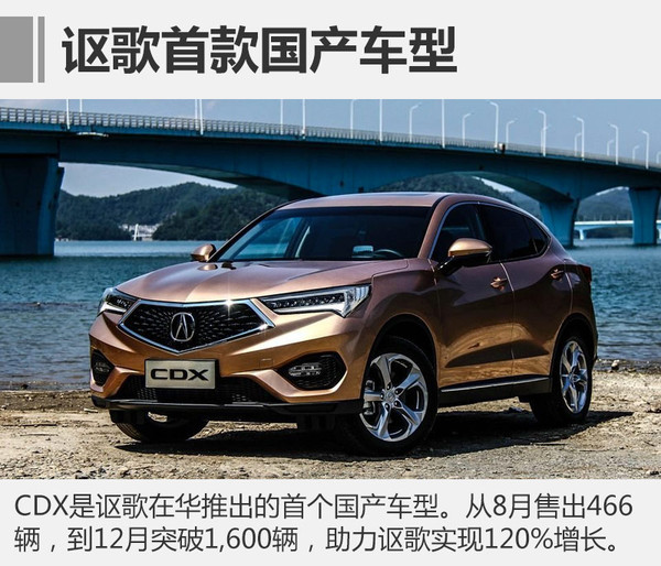 2016年7月,首款國產(chǎn)車型CDX正式上市,新車定位緊湊型SUV,同時也是謳歌產(chǎn)品體系中級別最小SUV車型。CDX上市后逐漸得到市場的認可,從8月份的466輛,增長至11月份的1,110輛,12月更是突破1,600輛。