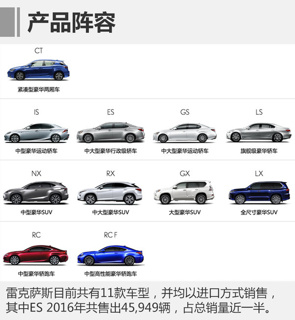 2016年12月,雷克薩斯共售出10,662輛,同比增長5.3%;1-12月累計銷量達109,150輛,已經(jīng)超額完成10萬輛的銷量目標。在各大豪華品牌不斷加深國產(chǎn)化進程的現(xiàn)階段,雷克薩斯自2004年建立獨立經(jīng)銷商網(wǎng)絡(luò)后,一直保持以進口方式銷售的豪華品牌。在十多年的發(fā)展中,其產(chǎn)品矩陣越來越豐富。