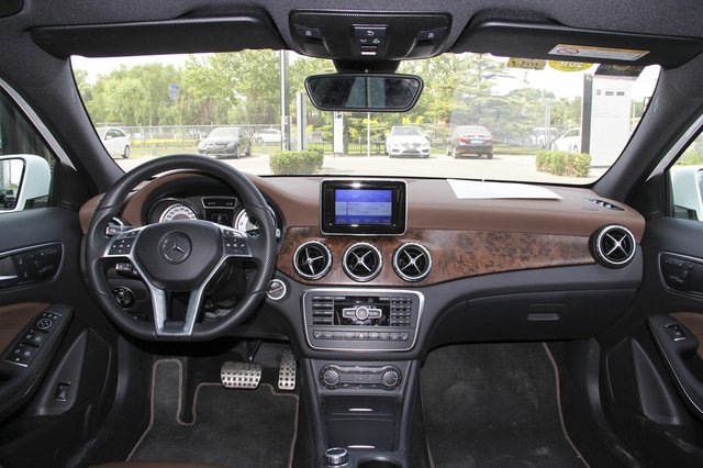 奔馳GLA的內(nèi)飾設(shè)計算是比較漂亮的,只是與奔馳其他車型采用相同的風(fēng)格總顯得不算太有誠意。中控臺采用了最新的家族風(fēng)格,配以大面積銀色飾板,往往能吸引到不少消費者的眼球。