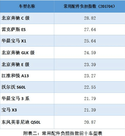 猜你還想看這些: 最新資訊,嫩模酒駕撞三人,開車發(fā)短信13死,女司機(jī)下車后被自己車撞》》》》 新車消息,5月新車,沃爾沃XC40假想圖,保時捷911特別版》》》》 用車指南,換機(jī)油后反而噪音大了,車險怎么買合適?》》》》 常用配件負(fù)擔(dān)指數(shù)方面,在汽車零整比系數(shù)基礎(chǔ)上,挖掘事故車維修數(shù)據(jù),選取配件損失率大于 1%的常用配件進(jìn)行研究,導(dǎo)入計算公式核算各車型的常用配件負(fù)擔(dān)指數(shù)。在樣本車型中最高的車型為北京奔馳 C級,常用配件負(fù)擔(dān)指數(shù)為 28.82;最低的車型為哈弗 H6,常用配件負(fù)擔(dān)指數(shù)為 9.32。