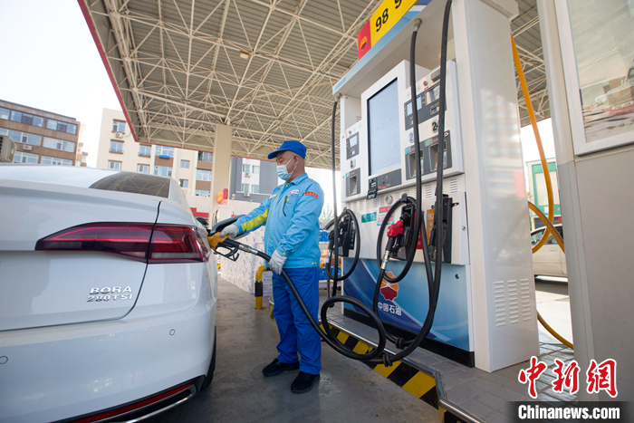 10月24日,山西太原,加油站工作人員正在給車輛加油。 中新社記者 張?jiān)?攝