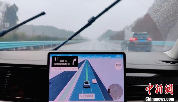 圖為國內(nèi)首個(gè)“智慧高速+車機(jī)導(dǎo)航”應(yīng)用在下雨的成宜高速上使用。 蜀道集團(tuán)供圖