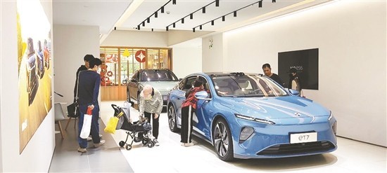 某蔚來空間體驗店內,購車者正在體驗新車