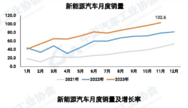 據(jù)中汽協(xié)數(shù)據(jù)顯示,2023年11月,我國(guó)汽車產(chǎn)量創(chuàng)歷史新高。汽車產(chǎn)銷量分別完成309.3萬(wàn)輛和297萬(wàn)輛,同比分別增長(zhǎng)29.4%和27.4%。其中,新能源汽車月度產(chǎn)銷量首次雙超百萬(wàn)輛,站上新臺(tái)階。11月,新能源汽車產(chǎn)銷量分別完成107.4萬(wàn)輛和102.6萬(wàn)輛,同比分別增長(zhǎng)39.2%和30%。