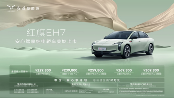 隨著環(huán)保意識的提升和新能源技術(shù)的飛速發(fā)展,新能源汽車成為全球汽車產(chǎn)業(yè)發(fā)展的新方向。紅旗新能源緊隨時代潮流,于3月20日在深圳舉辦“安心駕享·紅旗EH7上市發(fā)布會”,推出了其在新能源領(lǐng)域的里程碑產(chǎn)品——紅旗EH7,全國統(tǒng)一零售價為22.98萬-30.98萬元。這款車的推出,不僅增強(qiáng)了紅旗新能源的市場競爭力,也為汽車行業(yè)的綠色轉(zhuǎn)型和技術(shù)革新樹立了新典范。