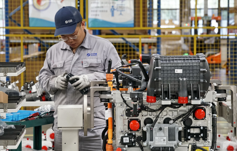 圖為在北京大興國際氫能示范區(qū)內(nèi),一家生產(chǎn)氫能燃料電池發(fā)動(dòng)機(jī)企業(yè)的員工在裝配設(shè)備。新華社記者 李欣 攝