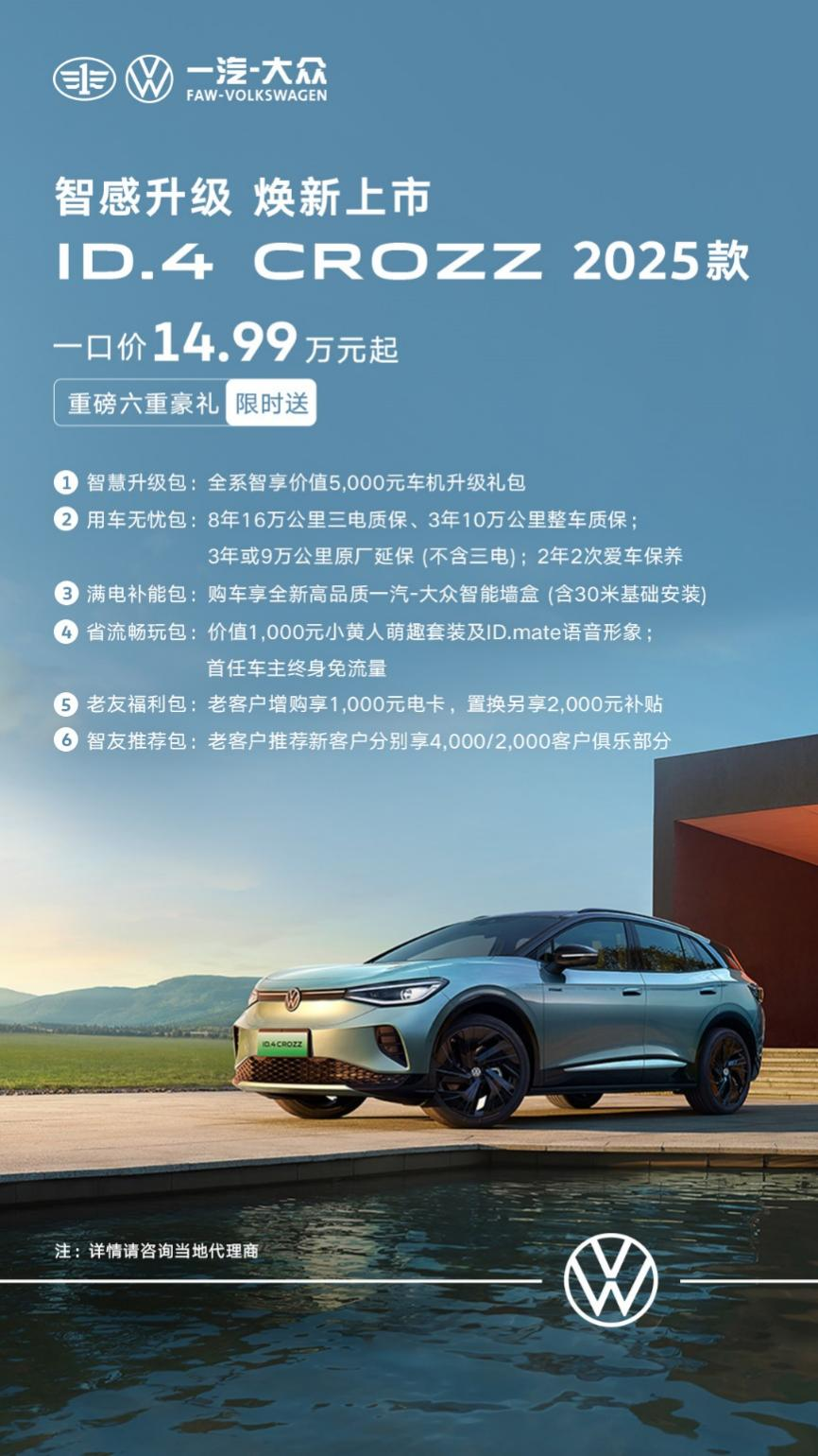 一汽-大眾ID.4 CROZZ作為MEB專(zhuān)屬純電平臺(tái)打造的純電汽車(chē)產(chǎn)品,憑借超高標(biāo)準(zhǔn)的整車(chē)安全、純正德系操控、真實(shí)續(xù)航及舒享空間,深受消費(fèi)者喜愛(ài)。隨著2025款產(chǎn)品的推出,一汽-大眾ID.4 CROZZ將繼續(xù)為用戶(hù)提供更安全、更可靠、更智能的電動(dòng)出行體驗(yàn),共同開(kāi)啟更加美好的出行新世界。