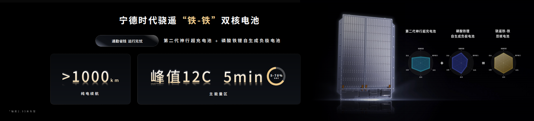 寧德時代鈉新24V重卡啟駐一體蓄電池,使用壽命突破8年,全生命周期總成本較傳統(tǒng)鉛酸蓄電池降低61%。同時鈉新重卡蓄電池具有全電量深度放電、零下40℃一鍵啟動、久置一年可啟動的優(yōu)勢,相比鉛酸蓄電池而言更高效、環(huán)保、經(jīng)濟,推動商用車進入“天下無鉛,車電同壽”新時代。 寧德時代在鈉離子電池性能上取得的重大突破,補足了電池在極寒環(huán)境下的應(yīng)用短板。鈉離子電池的性能突破是電池全場景應(yīng)用的關(guān)鍵突破。至此,寧德時代的驍遙雙核電池應(yīng)運而生。 驍遙雙核電池,開啟能量自由的多核時代 驍遙雙核電池是寧德時代雙核架構(gòu)、自生成負極技術(shù)深度融合的重磅產(chǎn)品。雙核架構(gòu),意味著電池包擁有兩個強大的“獨立能量區(qū)”,同時具備五大雙核功能,包括高壓雙核、低壓雙核、結(jié)構(gòu)雙核、熱管理雙核以及熱失控安全防護雙核,能確保動力輸出的連續(xù)性、穩(wěn)定性和安全性。這種雙核設(shè)計和軟件的智能協(xié)同將在未來L3、L4級智駕時代為整車提供更穩(wěn)定可靠的供能保障。 其中“自生成負極技術(shù)”則是原子層級的顛覆性突破,可讓電池的體積能量密度提升60%,重量能量密度提升50%,可在同樣的電池包空間內(nèi)配置更多的電量,支撐起更長的續(xù)航。該技術(shù)可以靈活適配各種材料體系,當(dāng)搭配三元體系時,能量密度最高可提升至1000Wh/L以上。