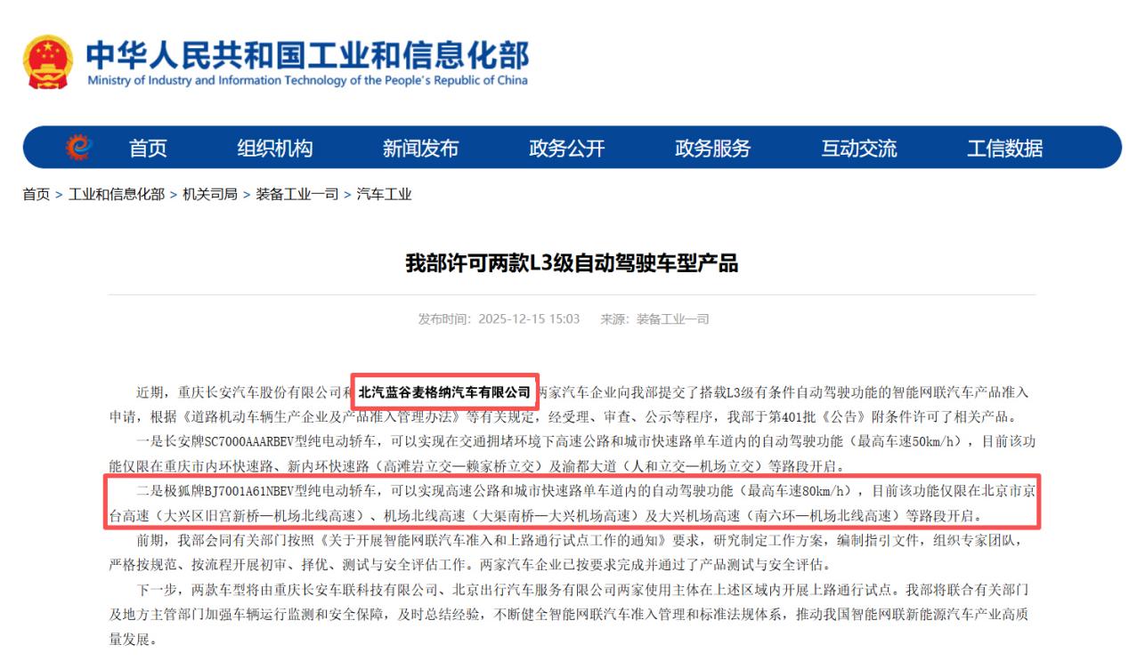 12月15日,北汽集團(tuán)旗下極狐阿爾法S(L3版)正式獲批工業(yè)和信息化部自動(dòng)駕駛車型產(chǎn)品準(zhǔn)入許可,即將在北京市限定區(qū)域內(nèi)開展L3級(jí)有條件自動(dòng)駕駛上路通行試點(diǎn)。這標(biāo)志著我國(guó)自動(dòng)駕駛技術(shù)發(fā)展逐步走向量產(chǎn)應(yīng)用階段,也是北汽集團(tuán)在自動(dòng)駕駛領(lǐng)域從技術(shù)驗(yàn)證階段邁向量產(chǎn)應(yīng)用階段的重要里程碑。