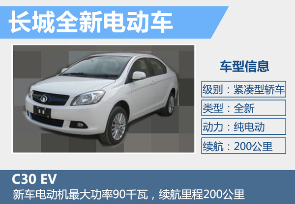 根據(jù)長城汽車此前公布消息,旗下首款純電動轎車將于2016年上市。網(wǎng)通社獲得了一組長城全新電動車型C30 EV的諜照及部分信息,新車外觀方面較燃油版車型在細(xì)節(jié)方面進(jìn)行調(diào)整,加入更多“EV”元素。新車搭載一臺功率為90千瓦的電動機(jī),續(xù)航里程有望達(dá)到200公里。