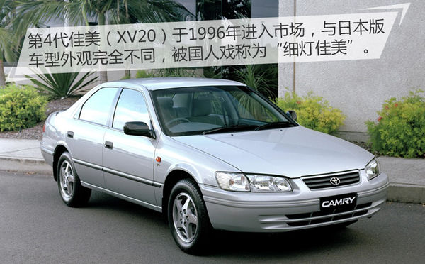 第4代佳美(XV20)于1996年進(jìn)入市場,進(jìn)入國內(nèi)的仍是佳美海外版車型,在設(shè)計上與日本本土版采用了完全不同的理念。讓整車看上去更加修長流暢,車頭和車尾都被設(shè)計得趨于扁平,由此帶來的是更細(xì)長的頭燈和尾燈,所以XV20在國內(nèi)被人們戲稱為“細(xì)燈佳美”。