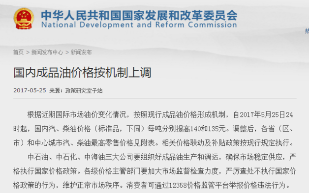 昨日(25日),國家發(fā)展和改革委員會發(fā)布消息稱,根據(jù)近期國際市場油價變化情況,按照現(xiàn)行成品油價格形成機(jī)制,自2017年5月25日24時起,國內(nèi)汽、柴油價格(標(biāo)準(zhǔn)品,下同)每噸分別提高140和135元。相關(guān)價格聯(lián)動及補貼政策按現(xiàn)行規(guī)定執(zhí)行。