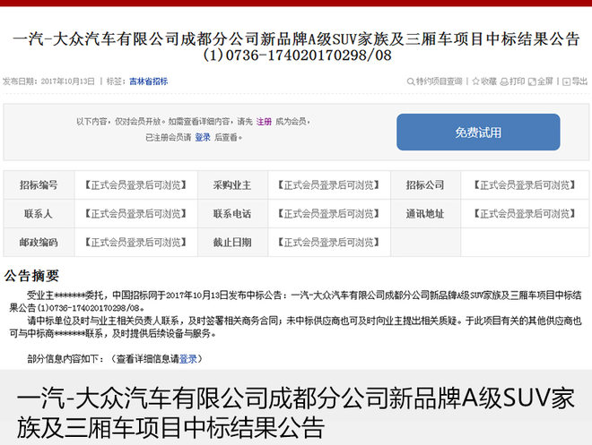 日前,中國招標(biāo)網(wǎng)正式公布了《一汽-大眾汽車有限公司成都分公司新品牌A級SUV家族及三廂車項目中標(biāo)結(jié)果公告》從公告上來看,一汽-大眾汽車有限公司正在成都工廠準(zhǔn)備新品牌A級SUV兩款車型以及另外一款三廂車項目。該項目主要用于投產(chǎn)一汽-大眾全新經(jīng)濟(jì)用車品牌,以滿足消費者對廉價車的購買需求。