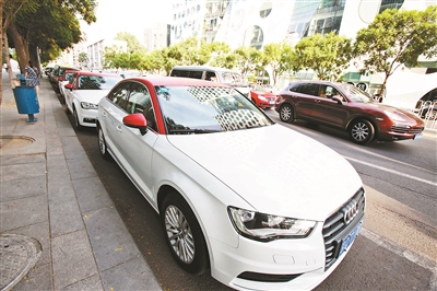 今年6月,北京CBD地區(qū)停放的EZZY分時(shí)租賃奧迪A3轎車(chē) 供圖/視覺(jué)中國(guó)