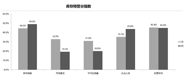 從庫(kù)存預(yù)警分指數(shù)來(lái)看,庫(kù)存指數(shù)、從業(yè)人員指數(shù)環(huán)比上升;市場(chǎng)銷量指數(shù)、平均日銷量指數(shù)、經(jīng)營(yíng)狀況指數(shù)環(huán)比下降。樊宇表示,2月庫(kù)存預(yù)警指數(shù)較高,依然位于50%的警戒線之上。同時(shí),因?yàn)槭袌?chǎng)需求和平均日銷量呈明顯下降狀態(tài),經(jīng)銷商面臨較大壓力。