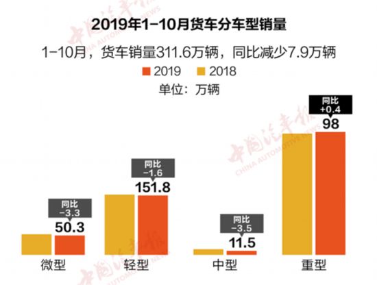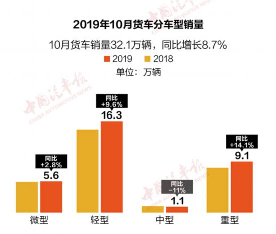 10月整體汽車銷量繼續(xù)下滑,同比下降4%,在車市寒冬中,商用車回暖態(tài)勢明顯,在各地加快更新淘汰及投資拉動等因素的影響下,本月商用車繼續(xù)保持較好的增長勢頭,漲幅與9月相比有擴大的趨勢。