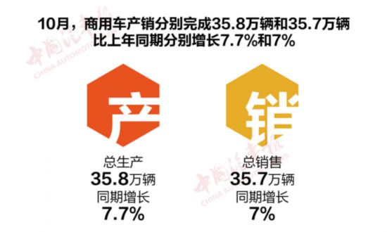 11月11日,中國汽車工業(yè)協(xié)會發(fā)布10月汽車產銷數據。商用車產銷分別完成35.8萬輛和35.7萬輛,比上月分別增長3.9%和4.8%,比上年同期分別增長7.7%和7%,與乘用車市場的“一片涼涼”相比,商用車產銷數據表現亮眼,市場加速回暖。