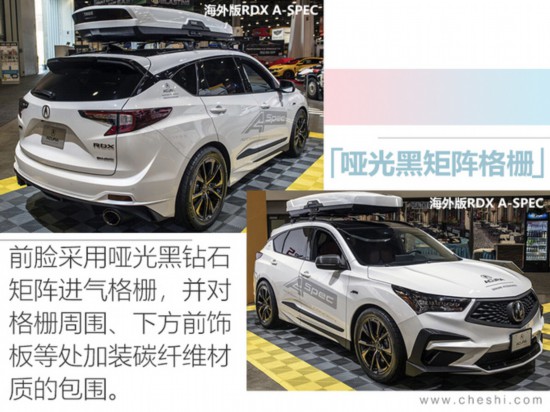 現(xiàn)款謳歌CDX分為燃油版和混動版兩種車型,明年謳歌CDX不僅會迎來改款,并將加入A-Spec的量產(chǎn)版車型,相比于普通版,CDX A-Spec概念版融入A-Spec專屬設(shè)計元素,原車的鍍鉻裝飾件更換為亮黑色裝飾件,前后包圍以及輪轂則采用了啞光設(shè)計,包括多輻式運(yùn)動輪圈、熏黑前大燈等,均增加了視覺沖擊力。而RDX A-SPEC的海外版與國內(nèi)版本相似,明年的量產(chǎn)版也將成為新款RDX的最大亮點,新車前臉依舊采用了啞光黑鉆石矩陣進(jìn)氣格柵,并對格柵周圍、下方前飾板、門框以及后擴(kuò)散器和后視鏡蓋等多處加裝了碳纖維材質(zhì)的包圍,整體更為激進(jìn)運(yùn)動,令人過目難忘。