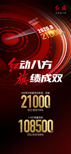 近日,紅旗對(duì)外發(fā)布8月銷(xiāo)售數(shù)據(jù)顯示:?jiǎn)卧驴備N(xiāo)量突破2.1萬(wàn)輛,同比增110%,其中HS5單品月銷(xiāo)過(guò)萬(wàn)。1-8月,紅旗累計(jì)銷(xiāo)量突破108500輛,同比增長(zhǎng)108%,繼續(xù)書(shū)寫(xiě)“新紅旗速度”。