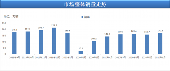 從整體市場(chǎng)銷量情況來(lái)看,8月乘用車市場(chǎng)零售銷量為170.3萬(wàn)輛,同比增長(zhǎng)8.9%,實(shí)現(xiàn)自2018年5月以來(lái)的最強(qiáng)正增長(zhǎng)。根據(jù)統(tǒng)計(jì),今年1-8月的零售累計(jì)增速-15.2%,較1-7月累計(jì)增速提升了3.3個(gè)百分點(diǎn),體現(xiàn)行業(yè)的快速回暖態(tài)勢(shì)。