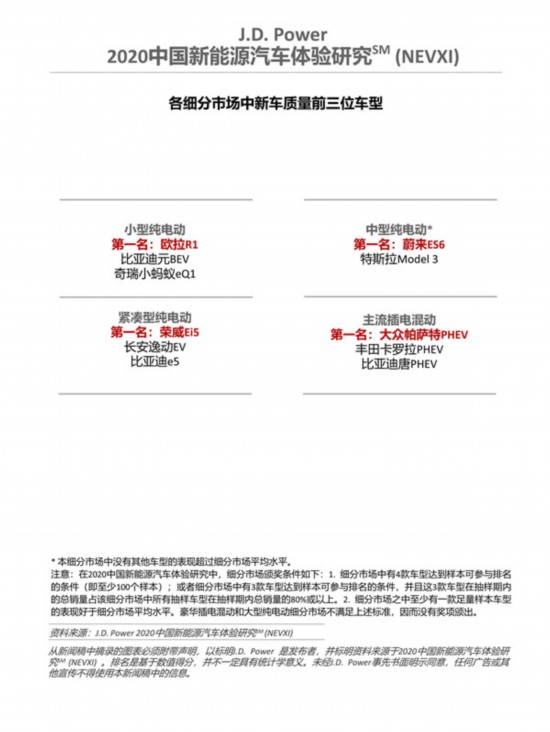 研究結(jié)果顯示,上汽大眾(105 個 PP100)獲得插電混動車市場新車質(zhì)量第一名,寶馬(108個PP100)位列插電混動車市場第二位。蔚來(109 個 PP100)獲得純電動車市場新車質(zhì)量第一名,特斯拉(113個PP100)和歐拉(129個PP100)位列純電動車市場第二和第三位;車型層面,歐拉R1榮獲小型純電動細(xì)分市場第一;榮威Ei5榮獲緊湊型純電動細(xì)分市場第一;蔚來ES6摘得中型純電動細(xì)分市場第一;大眾帕薩特 PHEV 摘得主流插電混動細(xì)分市場第一;豪華插電混動和大型純電動細(xì)分市場因?yàn)椴粷M足細(xì)分市場頒獎條件,因而沒有獎項(xiàng)頒出。